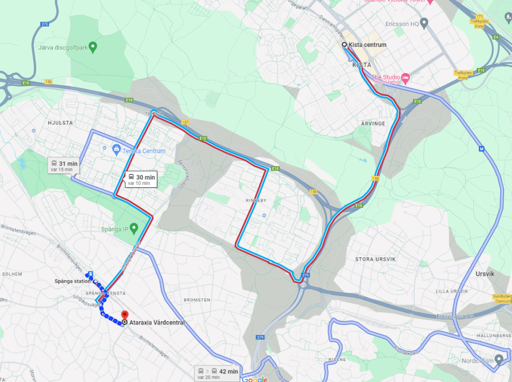 Vägbeskrivning från Vårdcentral Kista Centrum till Ataraxia Vårdcentral.